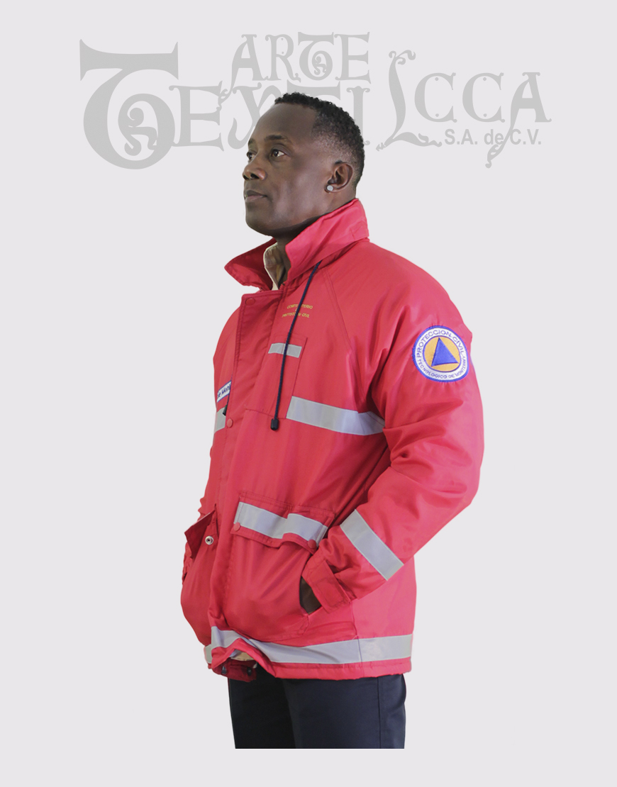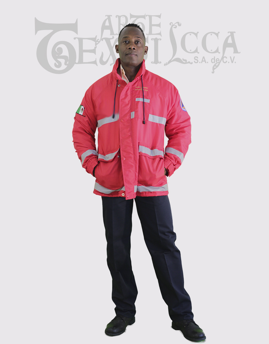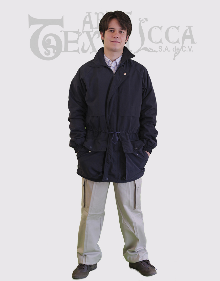 Chamarra larga con gorra oculta en cuello con cierre, con dos ojillos en cada lado con jareta y puntera de vista con vivo en frente y cuello, con dos ojillos de cada lado en la parte inferior de la chamarra para ajuste con elástico y ahorcador, con puño de cárdigan oculto Tallas de CH a la XXXCH.